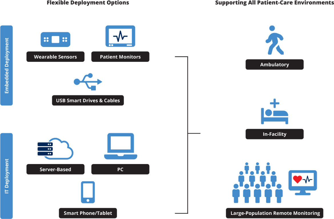 The M12A Enterprise Software Platform design framework creates an algorithm solution that can be used across a range of applications and use cases. The life-threatening arrhythmia algorithm can perform while on the patient, in a bed-side monitoring environment, or in a remote monitoring center, such as used in mobile cardiac telemetry.